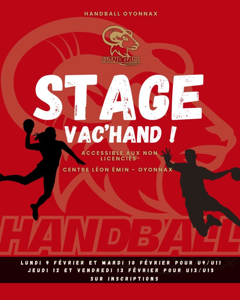📍 Centre Léon Emin – Oyonnax Ouvert aux licenciés & non licenciés ✨ Programme : 🔹 𝐔𝟗 & 𝐔𝟏𝟏 (9 & 10 février – lundi & mardi) 8h30 à 16h30 (permanence 7h30 – 17h30) Sortie au 1055 le mardi après-midi – 30 € / enfant pour 2 jours 🔹 𝐔𝟏𝟑 & 𝐔𝟏𝟓 (12 & 13 février – jeudi & vendredi) 8h30 à 16h30 Sortie au 1055 le vendredi après-midi – 30 € / enfant pour 2 jours 🍴 Repas sorti du sac chaque jour ⚡️ Inscription obligatoire le lien – Paiement sur place le 1er jour du stage 👉 Viens profiter d’un stage 100% handball, fun et conviviale avec le Handball Oyonnax !